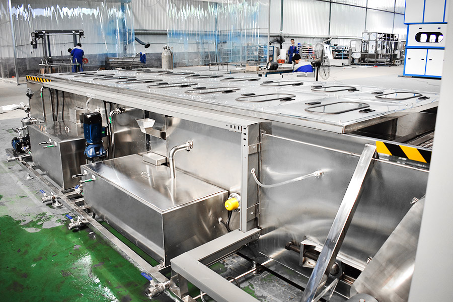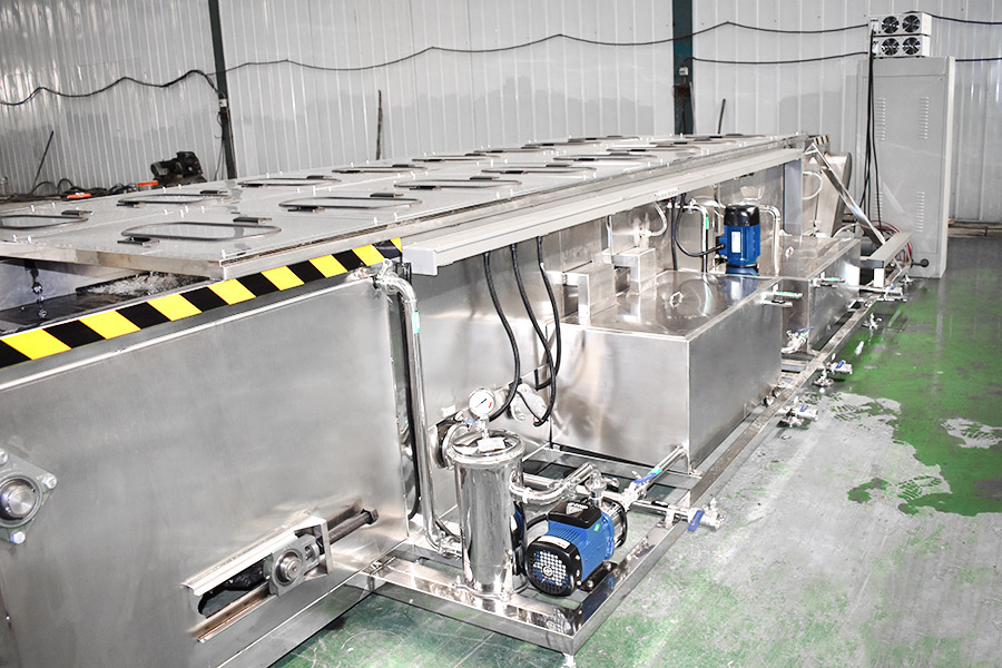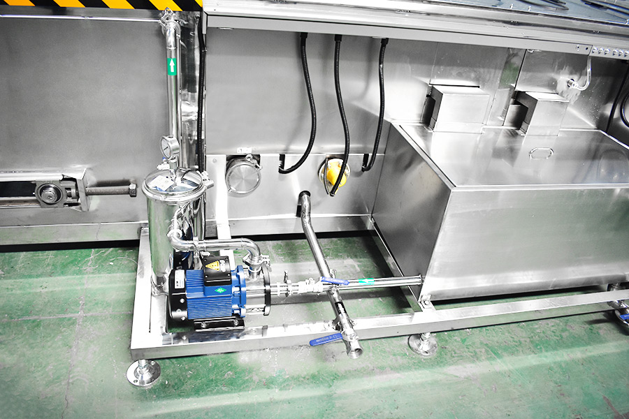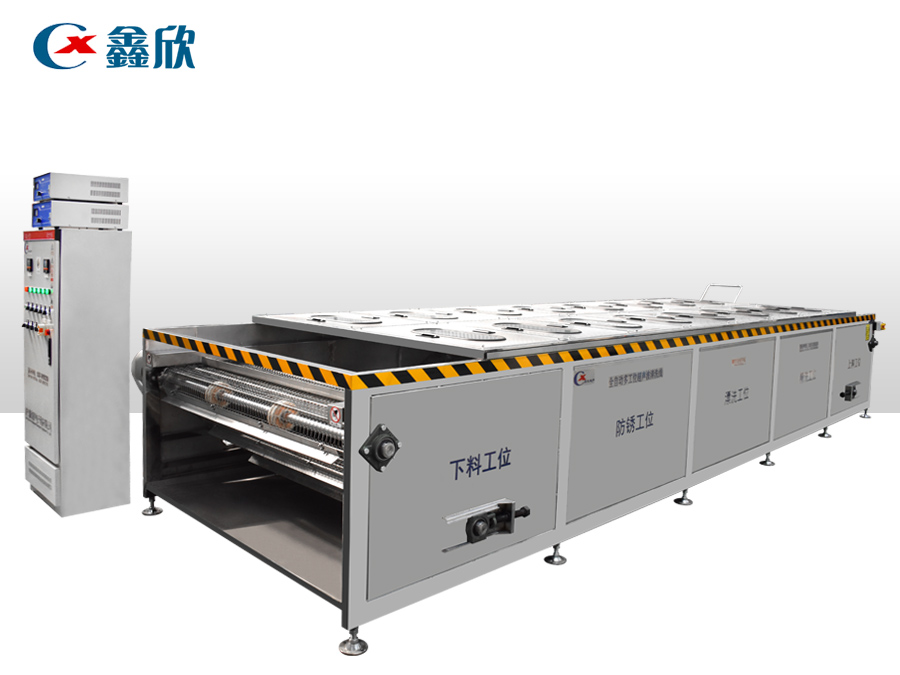 該設(shè)備有上下料網(wǎng)帶、超聲波清洗工位、噴淋漂洗工位、高壓風(fēng)切、熱風(fēng)烘干工位、溫控水加熱系統(tǒng)、風(fēng)機(jī)、溫控空氣加熱系統(tǒng)、移動(dòng)式風(fēng)刀、PLC+觸摸屏控制系統(tǒng)、管路系統(tǒng)及智能電器控制系統(tǒng)等組成。自動(dòng)進(jìn)排液和自動(dòng)加溫系統(tǒng)完全實(shí)現(xiàn)了無人干預(yù),自動(dòng)運(yùn)行,很大程度上降低了工人的勞動(dòng)強(qiáng)度。先進(jìn)的霧氣處理系統(tǒng)可以將清洗時(shí)產(chǎn)生的霧氣冷凝回流,空氣經(jīng)過濾和活性炭吸附后排出。
